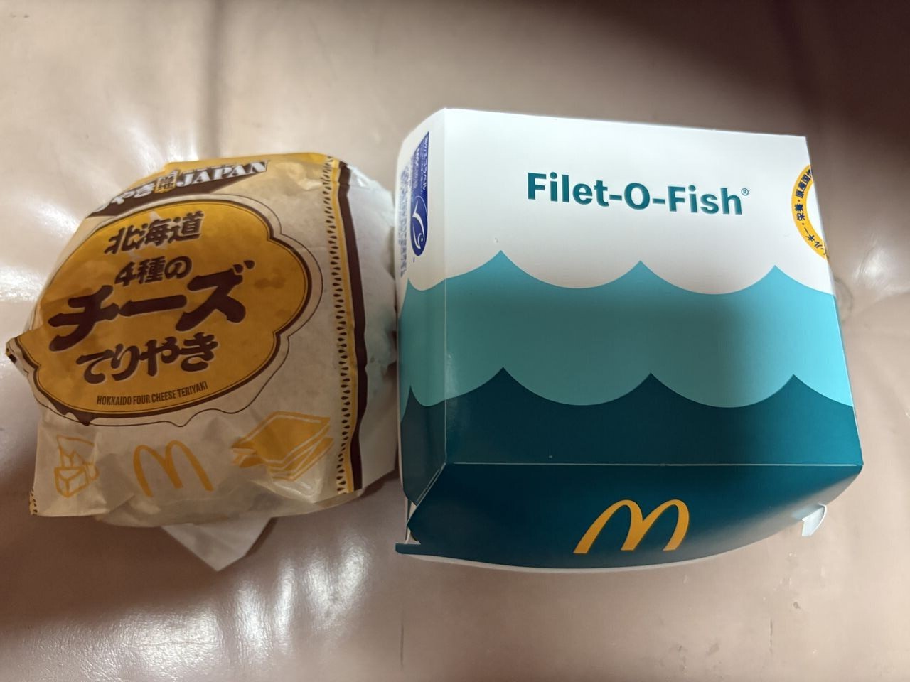 マクドナルドのチーズてりやきバーガーとフィレオフィツシュバーガー&桃のシェイクだったかな?