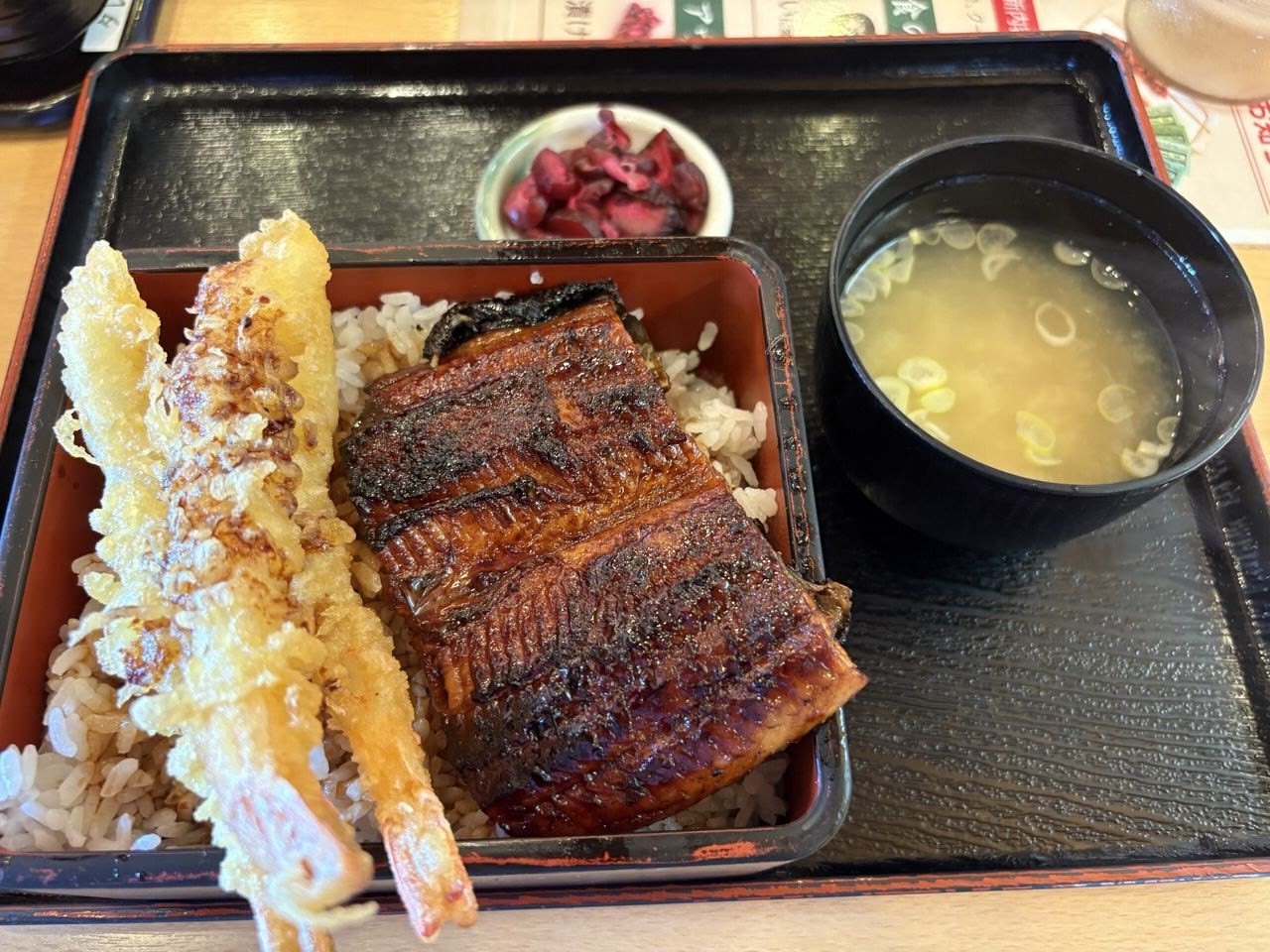 グランシップ近くの「戸隠蕎麦」に行こうとしたら、駐車場満車で入れず、その先のウナギ屋さんで、鰻&海老天丼。