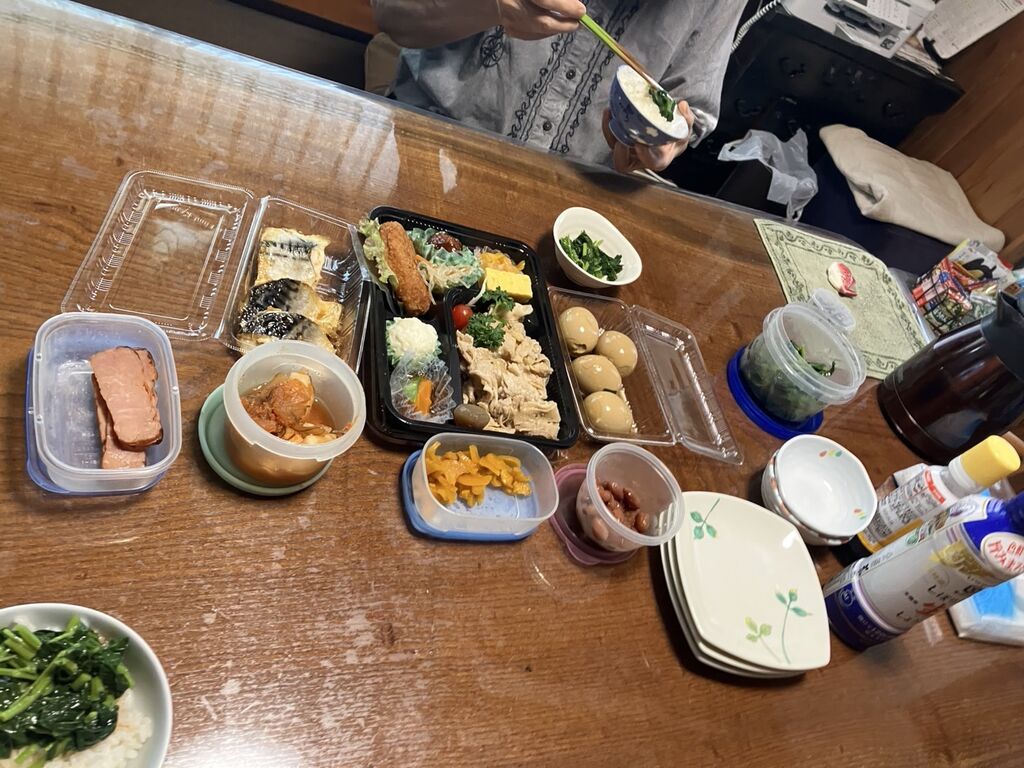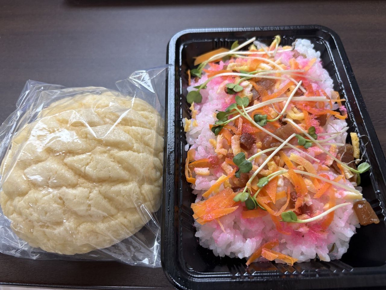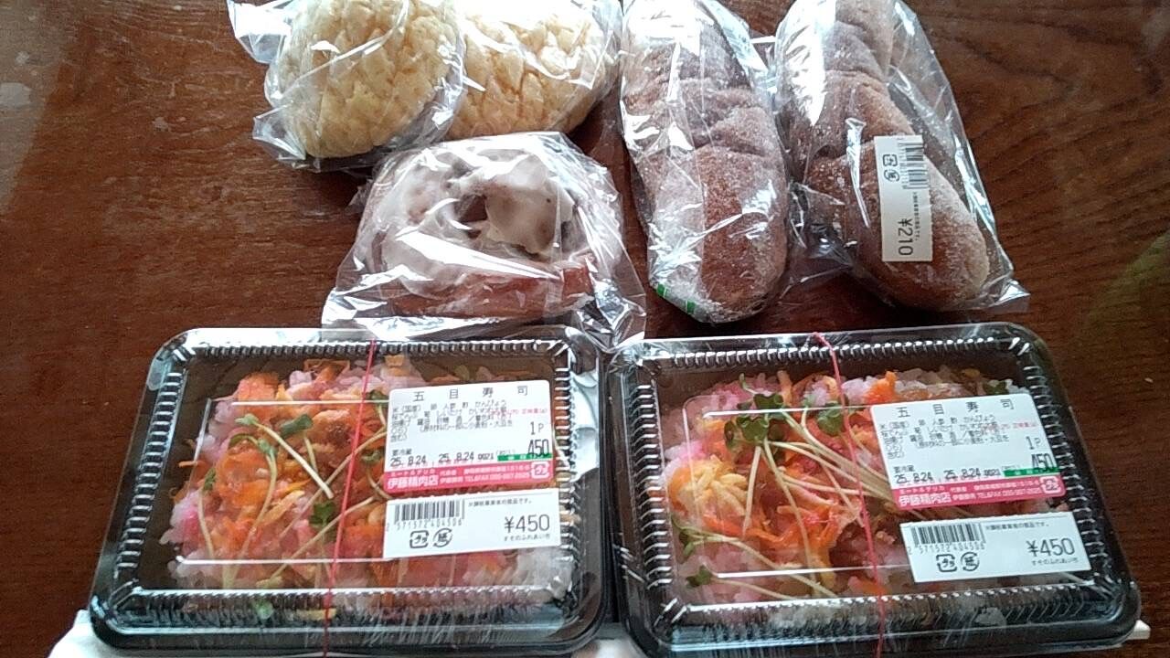 ある日の昼食は、妻が買ってきたお弁当とパン。