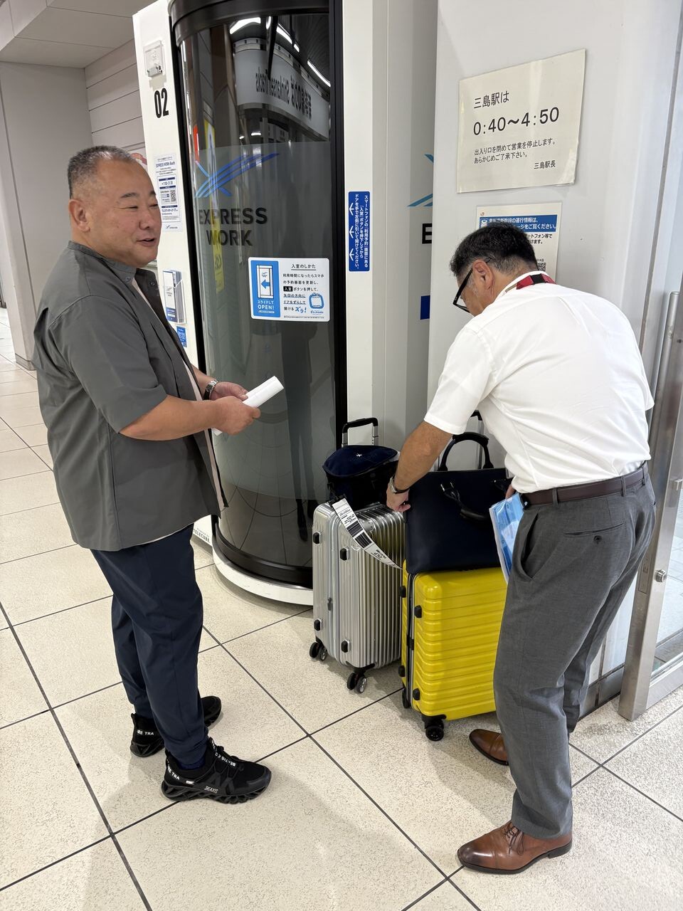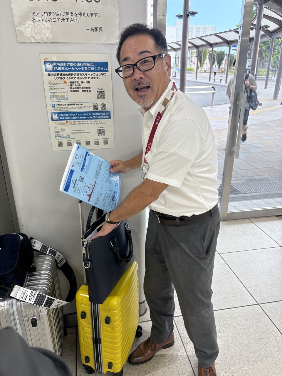 この日は建設業協会の視察研修旅行で大阪万博へ行くため、新幹線の三島駅に到着。
