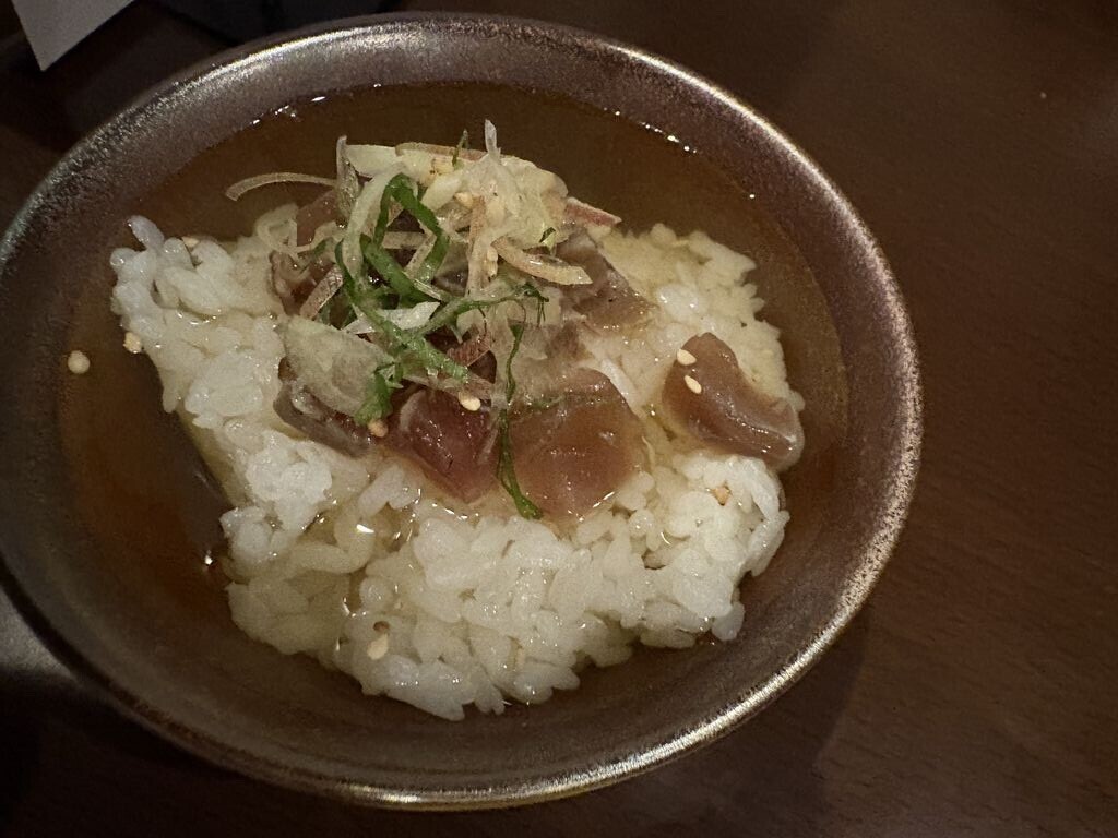 締めは、鰹?のお茶漬け。 会の締めは根上さん。