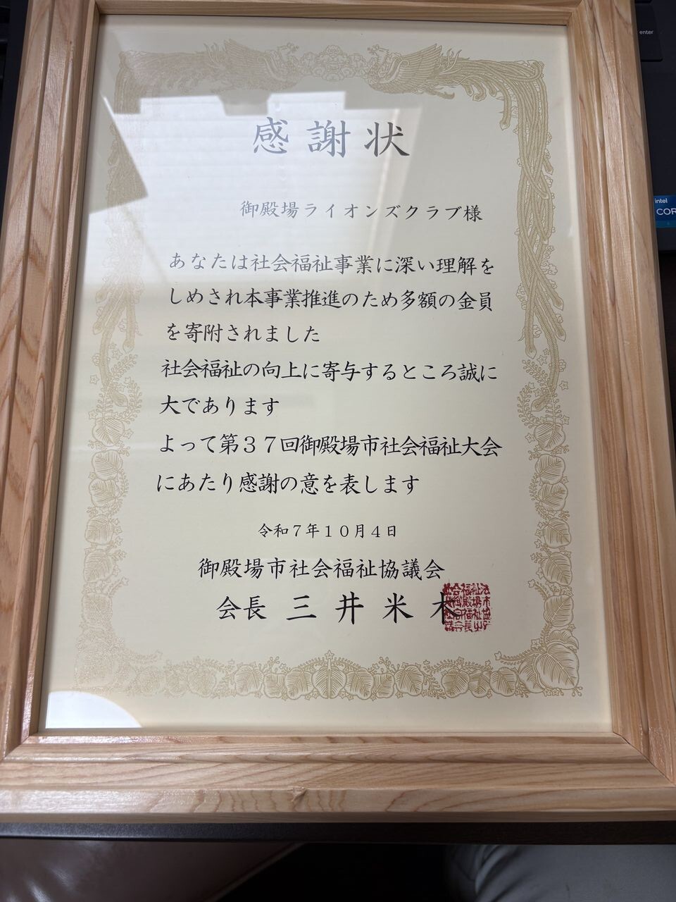 御殿場市の社会福祉大会で御殿場ライオンズクラブが感謝状をいただきました。本年度会長として出席し、受け取らせていただきました。