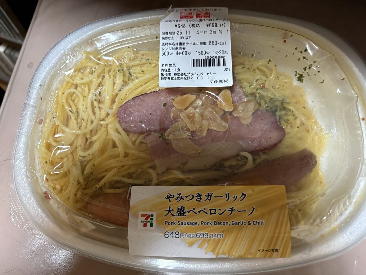 ある日の昼食は、やみつきガーリック大盛ペペロンチーノ。