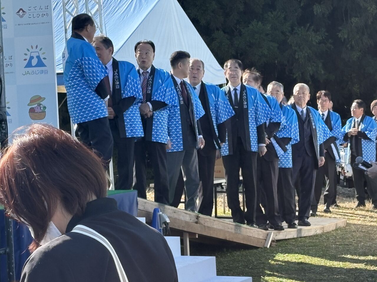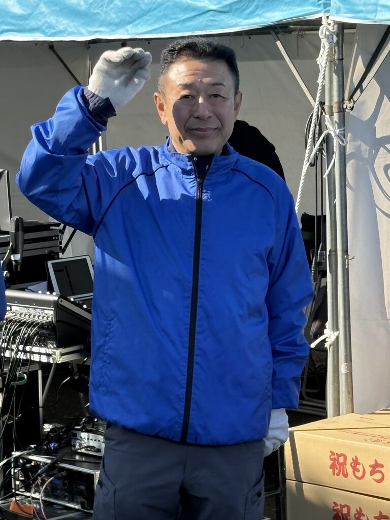 餅まきが始まります。勝又市長、手を振る若林参議院議員。