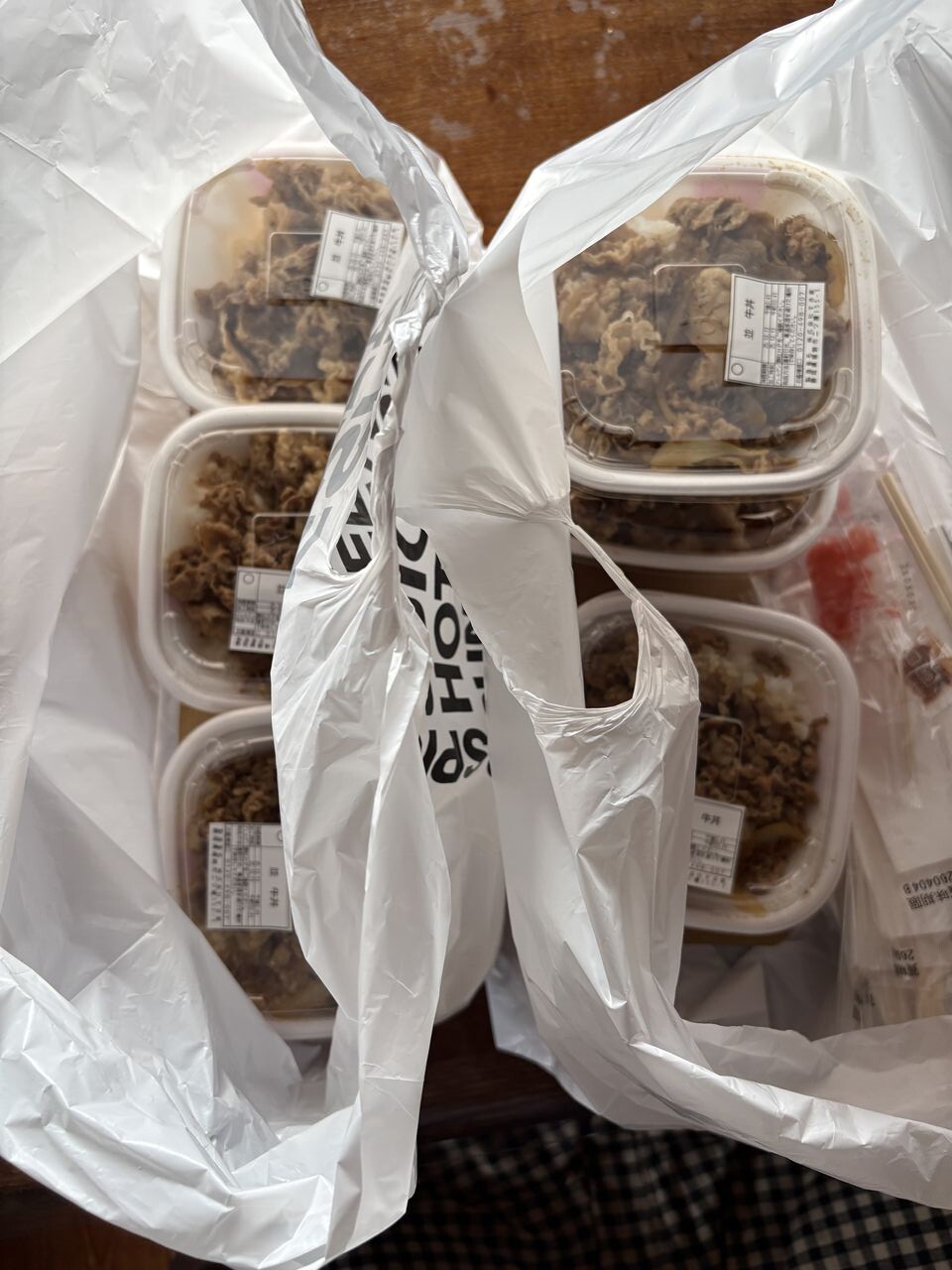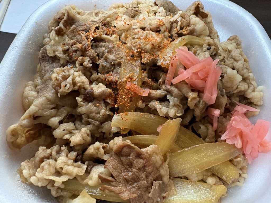 ある休日のお昼は、私が出先から買ってきた「すき屋」の牛丼。
