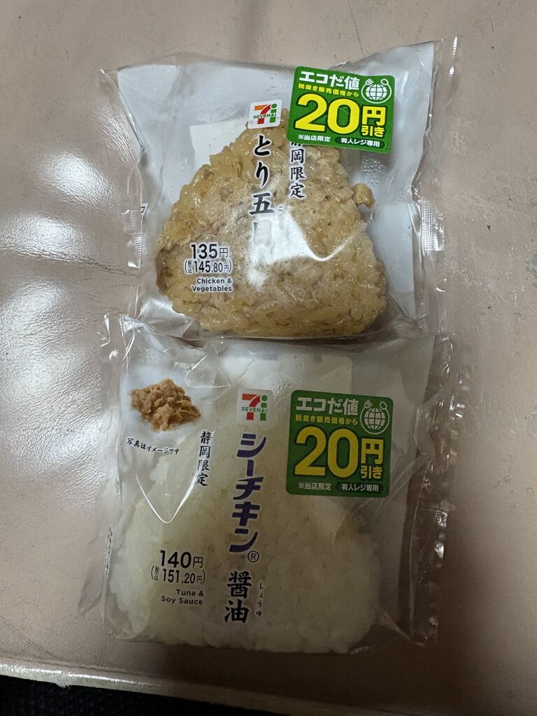 20円引きのお握り、とり五目、シーチキン。まいうー!