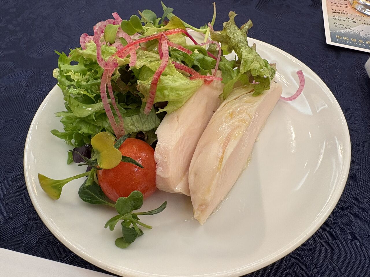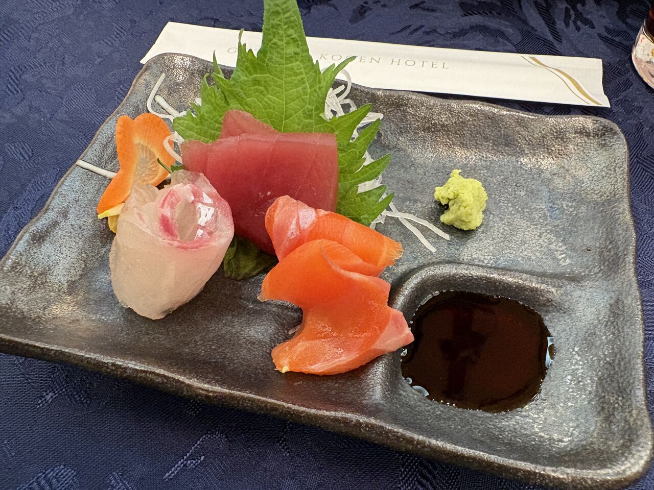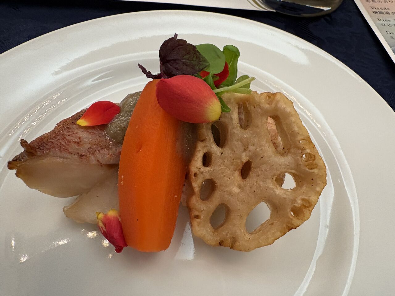 焼き魚、赤魚のポアレ。 スープ、ごぼうのプルーテというらしい。