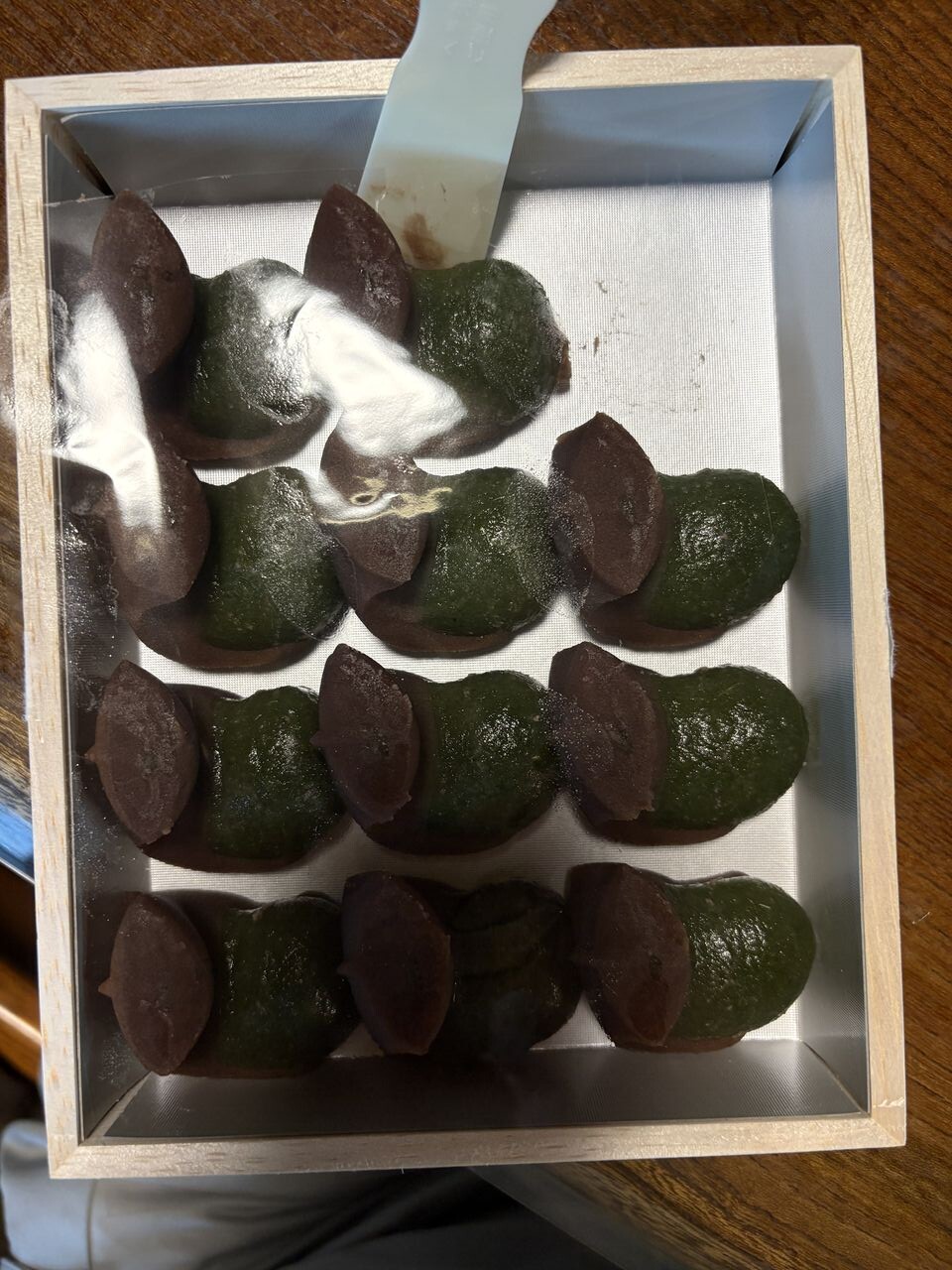 赤福の草餅バージョンみたいなやつで、美味しいです。