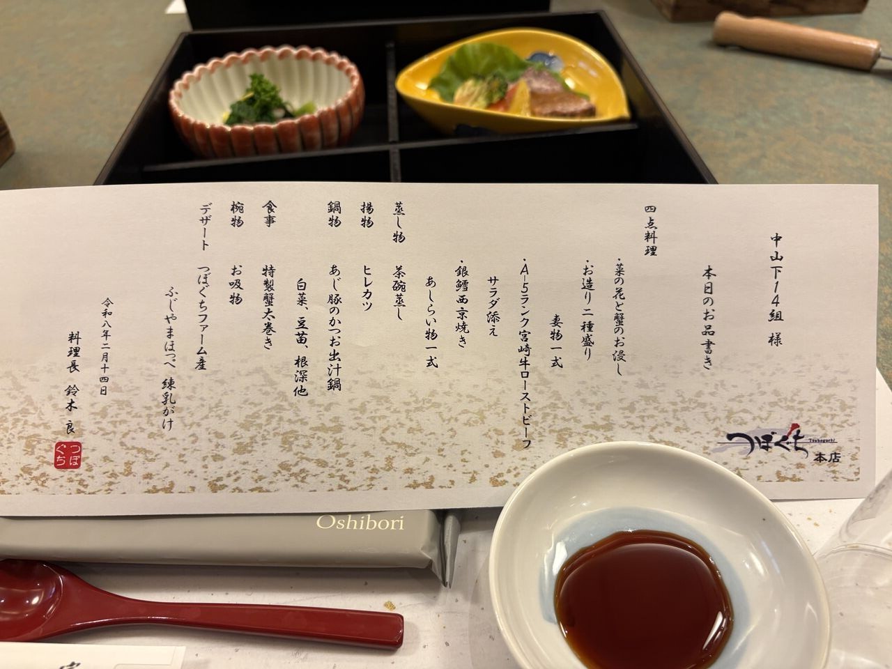 組の新年会、つぼぐち本店、あじ豚の鍋、菜の花と蟹のお浸し、ローストビーフ、お造り、銀鱈の西京漬け、茶碗蒸し、ヒレカツ、蟹の太巻き、ふじやまほっぺ、サービスショット!