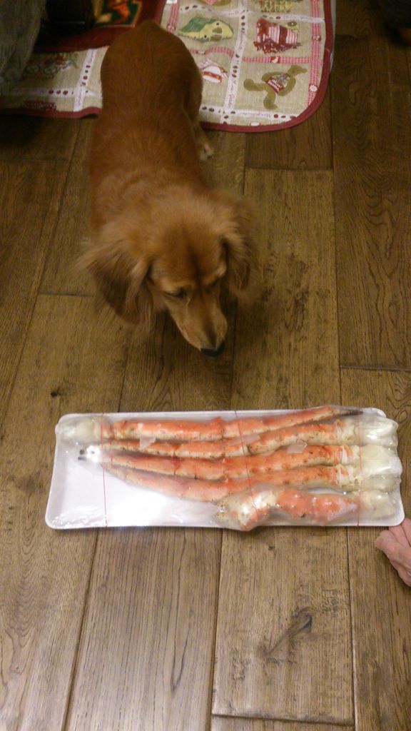 頂き物のカニに恐々近づくタロー